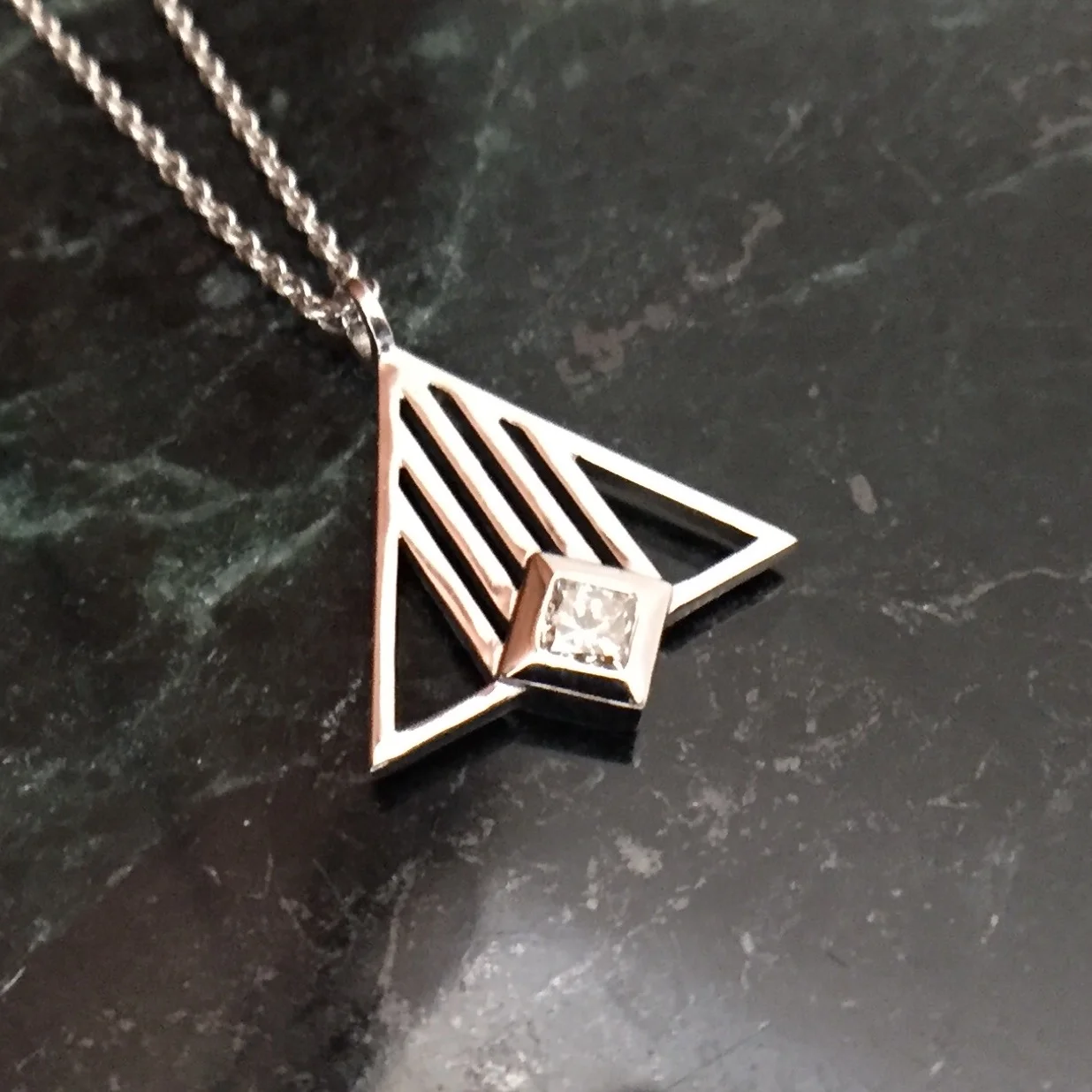 We designed and created this pendant from a customers white gold and princess cut diamond ring. The brief; to design and make a triangular pendant which could be worn everyday. Our customer wanted the design to have a modern 'art deco' feel with pierced out detailing.